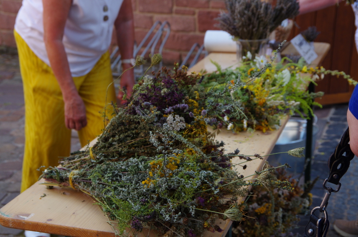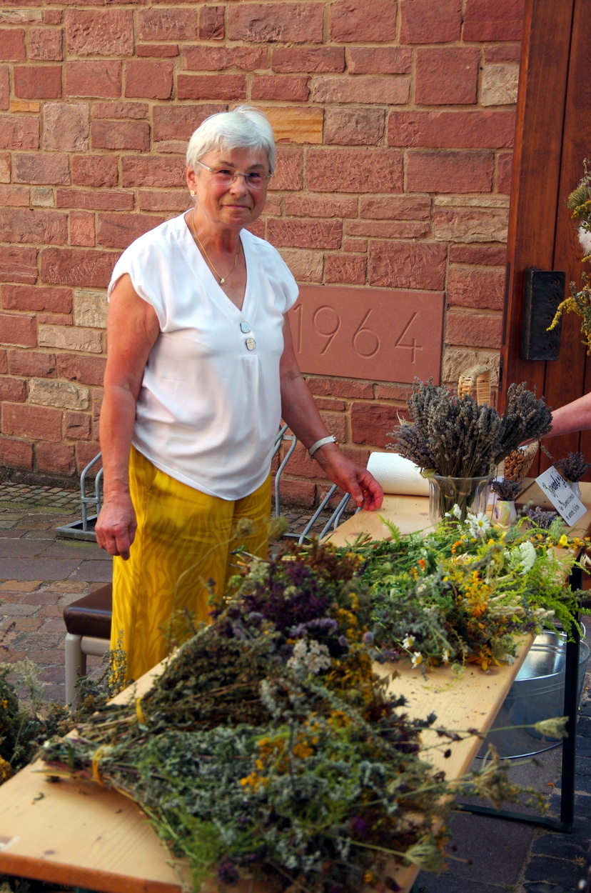Rita Reichert und Christel Reis hatten Kräuterbüschel gebunden und Lavendelsäckchen gepackt; sie waren vor der Kirche gegen Spende zugunsten des Blumenschmucks in der Kirche ausgegeben worden. Diese und selbst mitgebrachte Kräuterbündel wurden vor dem Schlussgebet gesegnet.