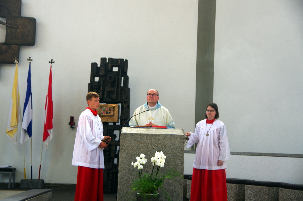 Trotz Ferien fanden sich drei Messdiener, die mit Pfarrer Rettinger in die Kirche einzogen, so dass sie "Weihrauch machen konnten".