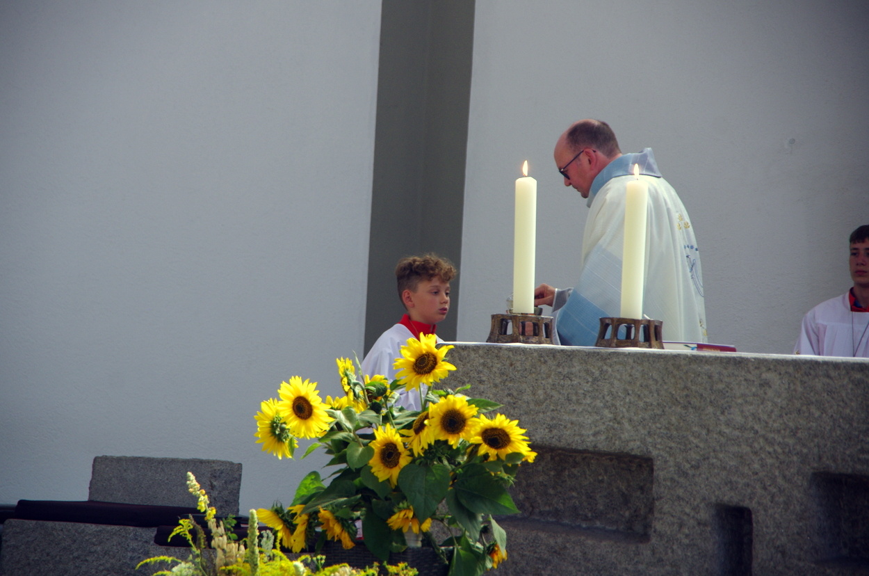Pfarrer Rettinger fasste sich im Hinblick aif die drückende Hitze in der Kirche bei der Predigt kurz: "Was zeichnet Maria aus?" Es gebe nur wenige Texte über sie in der Bibel und sie habe ein Leben geführt, das wir unsern Töchtern nicht wünschen würden: als Jugendliche schwanger mit fraglichem Vater des Kindes, einfachste Verhätnisse, Flucht, ein Sohn, der seinen eigenen Kopf hatte und letztlich der Tod des einzigen Kindes. Dennoch preise sie die Größe des Herrn, wie wir in dem Evangelium gehört haben. Lukas hebe damit Maria hervor, denn sie durfte den Menschen zur Welt bringen, in dem Gott seiner Liebe zu den Menschen Hand und Fuß gab. Daher sei sie die wichtigste Verbündete Gottes und das beste Beispiel für das Zusammenspiel zwischen Mensch und Gott. In Marias Leben leuchte die Herrlichkeit Gottes über den Tod hinaus. Ihr Leben zeige, dass Gott uns etwas zutraue und wir nicht über die Zumutungen jammern sollten, mehr Dankbarkeit zeigen als unzufrieden sein, mehr Vertrauen in Gott legen als die Haltung des Ewig-zu-kurz-kommens zelebrieren. "Dann sind wir Gott ganz nah und das schon vor dem Tod".