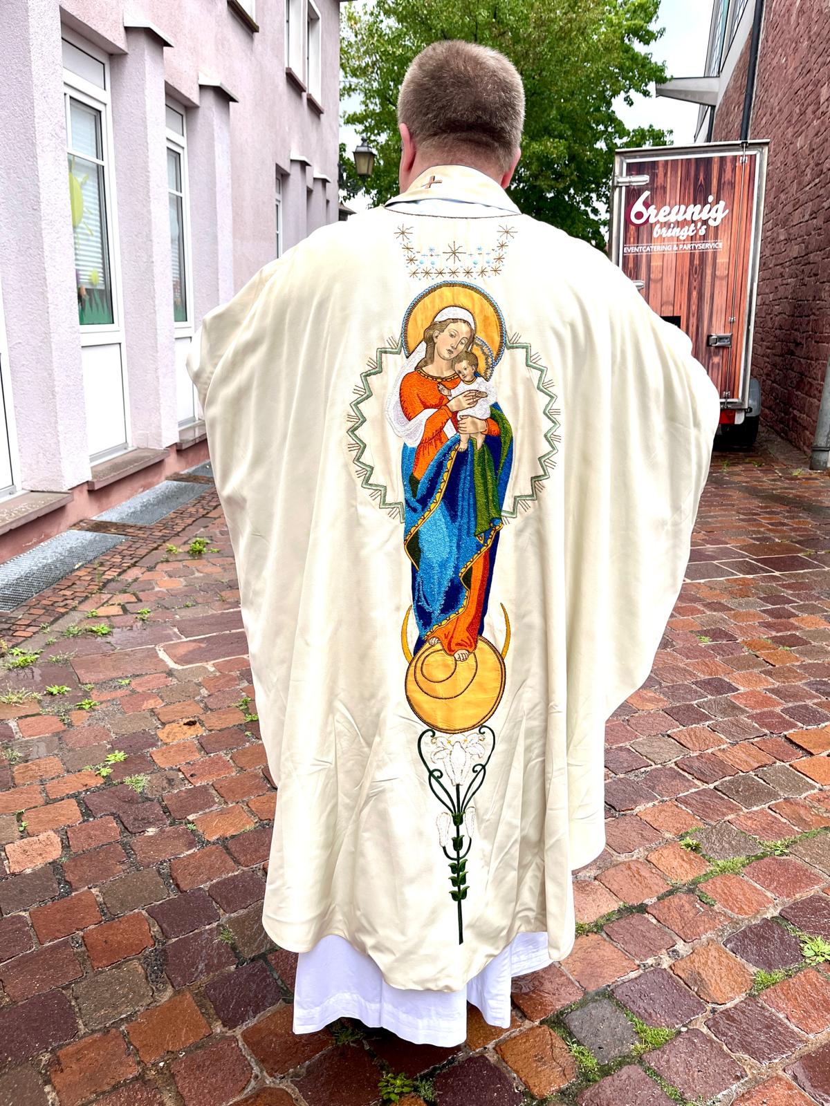 Neue Pfarrer bringen auch neue Blickwinkel und so hörte die Kichenverwaltung interessiert zu, als Pfarrer Rettinger erzählte, dass das Mariengewand nicht nur kaputt sei (was jeder wusste), sondern rettungswürdig. Die große handgestickte Stickerei könne von Fachleuten abgenommen werden und auf ein neues Gewand gebracht werden; die einzelnen Stickereien würden neu gemacht werden. Kosten? Nicht unerheblich. Aber es lohnt sich. Sollten wir nicht Traditionen an unsere Kinder weitergeben? Das ist das einzige vergleichbare Parament in Obernburg. Weiß vielleicht jemand, wo es herkommt? Die Pfarrei hat kein Geld, daher: es wird um Spenden gebeten, Spendenquittungen werden ausgestellt. Vielen Dank!