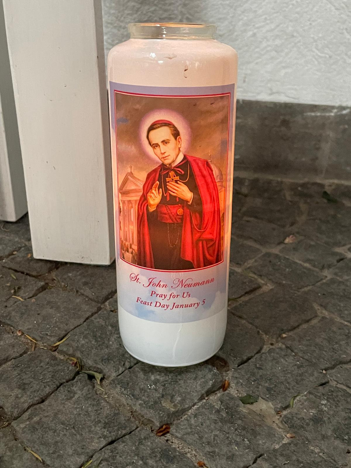 OK, gut, und wo ist die Relevanz? Unsere Homepage ist doch immer topaktuell! Ja, ist sie. Denn bei der Köln-Walldürnwallfahrt (die stets in Obernburg für eine Übernachtung Halt macht) nahm 2025 ein Ehepaar aus Troisdorf teil. Deren Sohn lebt seit einger Zeit in Philadelphia. Dort haben sie eine Kerze mit dem Bild des heiligen Johannes Nepomuk gekauft und als quasi Heimatort der Obernburger Pfarrei mitgebracht. Das zeigt doch mal wieder, wie international die Kirche ausgerichtet ist und gleichzeitig, wie alles zusammenhängt. Die Kerze wurde in der Pfarrkirche unter die Statue des Heiligen gestellt. Ein herzliches Dankeschön allen Beteiligten!