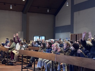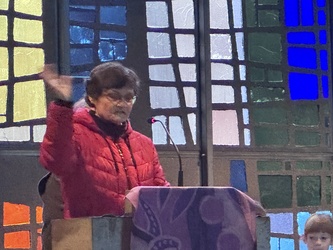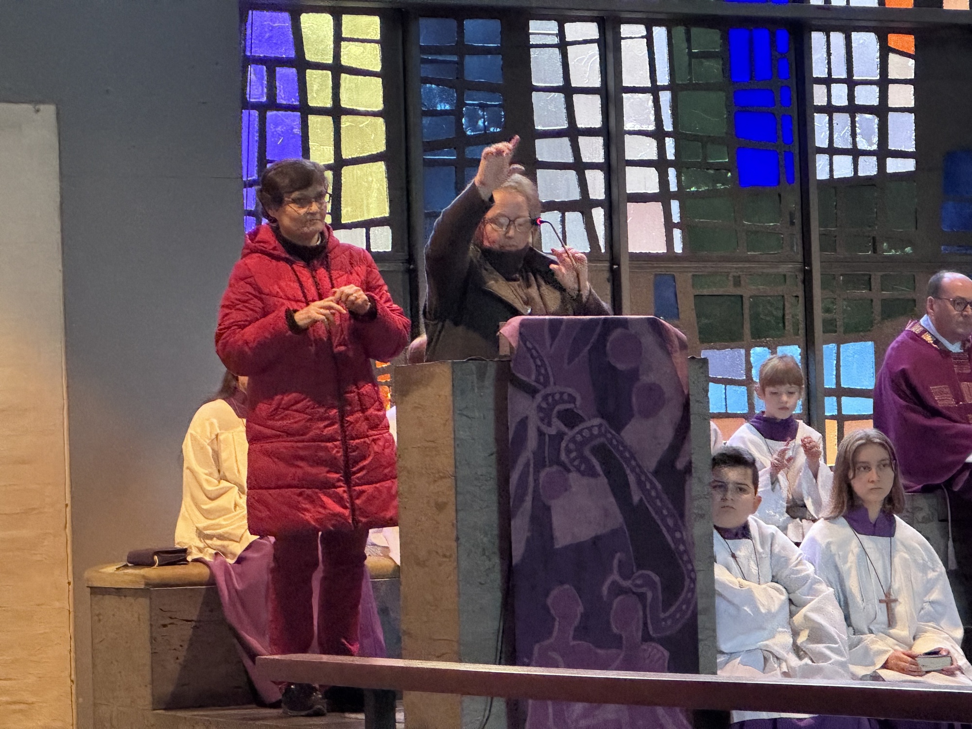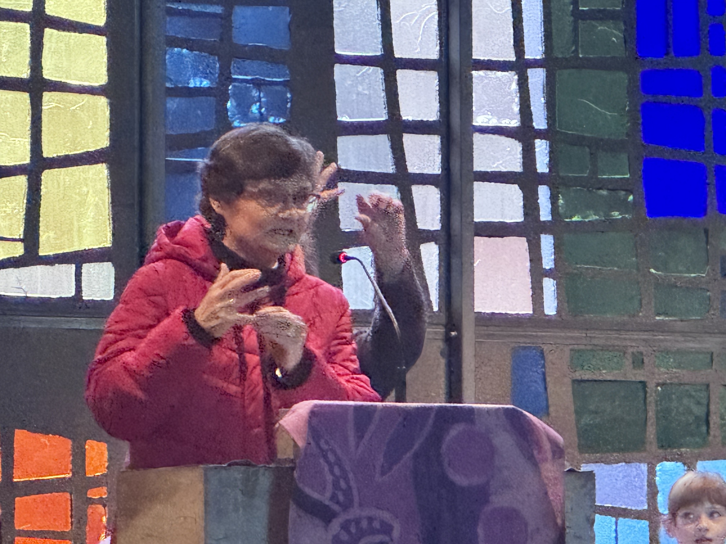 Edeltraud und Heike vom FamGoTeam standen oben am Ambo und streckten eine Hand aus und erklärten: