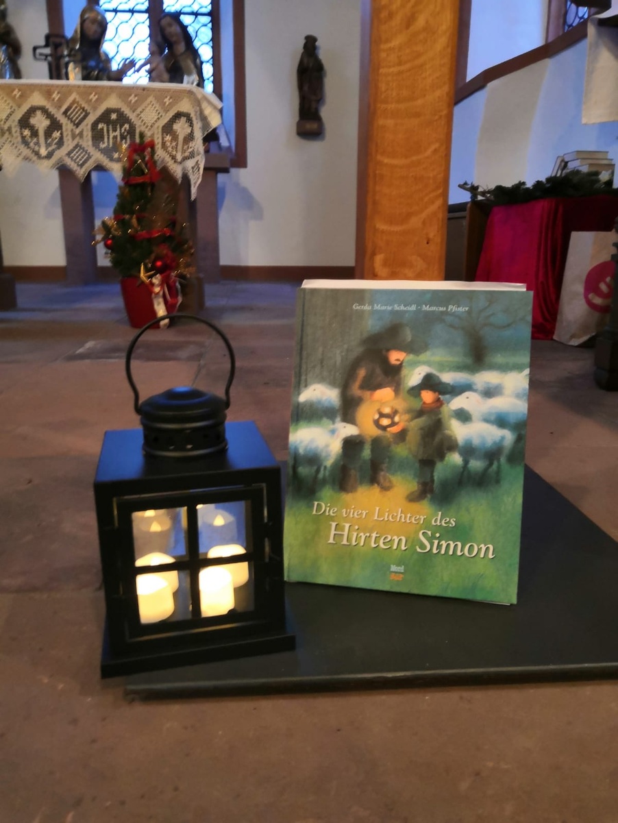 Angelika Hennrich erzählte die Geschichte „die 4 Lichter des Hirten Simon“ : Ein kleiner Hirte, der sein Schaf verliert und beim Suchen auf Menschen und Tiere trifft, die von der Gesellschaft ausgeschlossen sind. Jedem lässt er zum Trost ein Licht da. Zum Schluss findet ersein Schaf in der Krippe wieder.