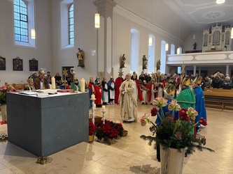 Der Aussendungsgottesdienst begann um 9.00 Uhr mit Pfarrer Simon. Feierlich zog er mit den 30 Königen in die Eisenbacher Pfarrkirche ein. In seiner Predigt griff er den Begriff Dickkopf auf. Ein solcher zu sein, sei auf den ersten Blick erst einmal keine lobende Bezeichnung. Auch der Umgang mit solchen sei nicht immer einfach. Doch gehöre auch immer eine gewisse Portion Dickköpfigkeit dazu den eigenen Standpunkt zu vertreten oder auf den Glauben gesehen Gott treu zu bleiben und den Weg des Glaubens zu gehen. Auch die Sternsinger hätten heute einen Dickkopf gezeigt. So seien sie früh aufgestanden, würden die Kälte in Kauf nehmen und heute auf die Straße gehen, um für die Kinder, denen es nicht so gut geht, sammeln. Und diese Eigenschaft verdiene einfach Anerkennung.