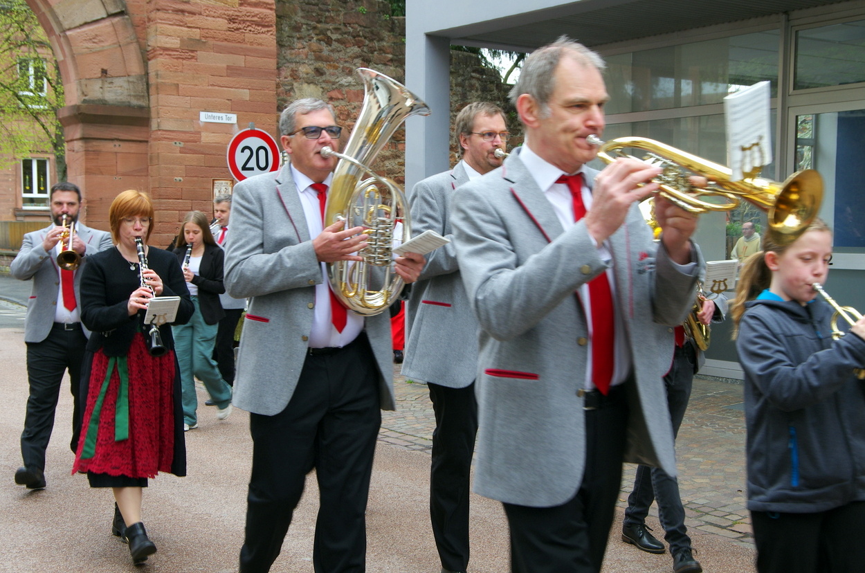 15 Erstkommunionkinder zogen in Begleitung des Musikvereins, 11 Messdienern und Pfr Rettinger vom Pfarrhaus aus in die festlich geschmückte und gut besuchte Kirche  ein. Dort stellten sie zunächst ihre Kerzen vor den Altar, bevor ein Junge alle Besucher herzlich begrüßte. Die musikalische Begleitung des Gottesdienstes hatten, wie immer perfekt, Schmitti & Friends übernommen. Unterstützt wurden sie dabei von dem Kinderchor PRO, der von der Empore aus wunderbar sang. Die Eltern hatten ein sehr schönes Liederheft gestaltet.