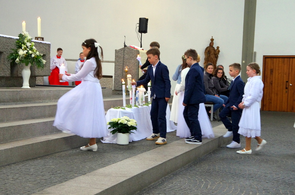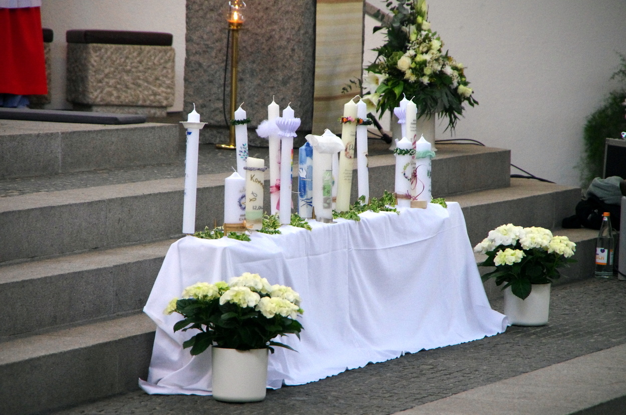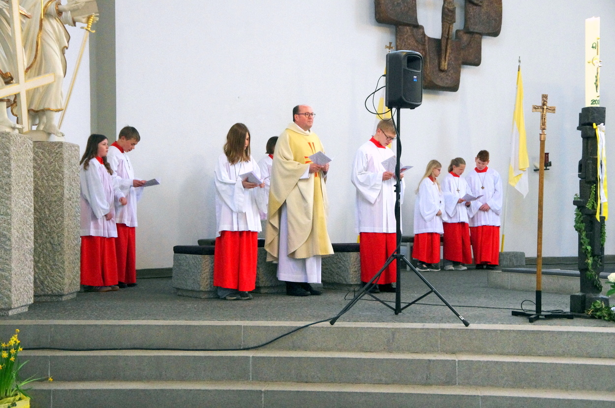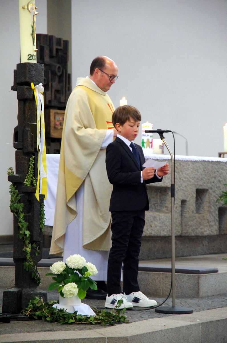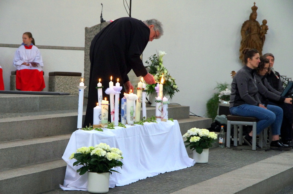 Vor den von Kommunionkindern verlesenen Fürbitten entzündete der Küster Günter Rosenberger die Kommunionkerzen und die Kinder stellten sich damit um den Altar, um ihre Taufgelübde zu erneuern. Die gemeinde bestätigte dies mit dem Lied "Fest soll mein Taufbund immer stehen".
