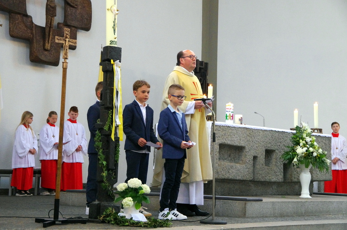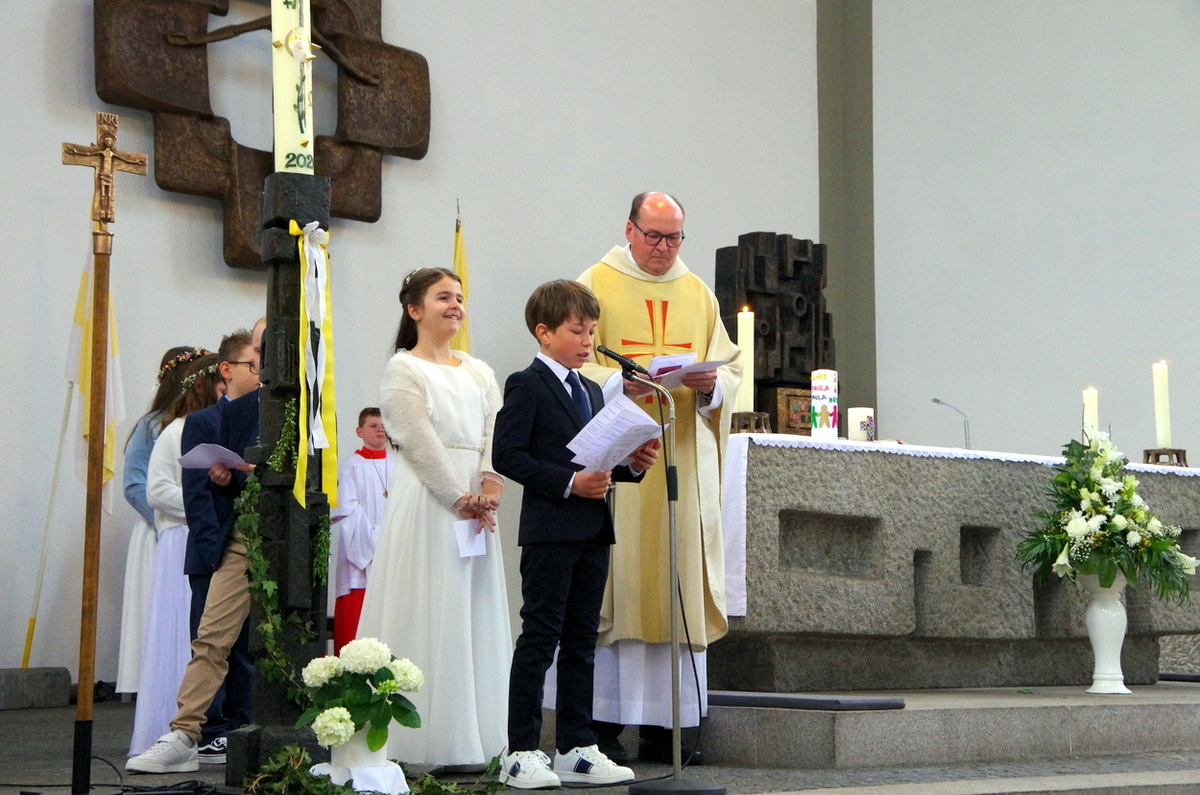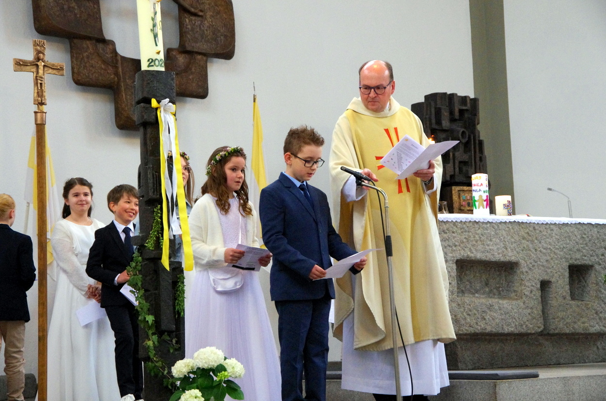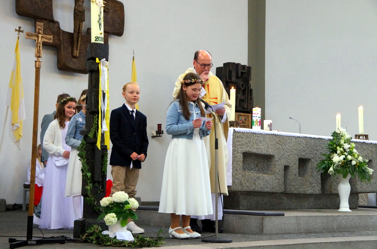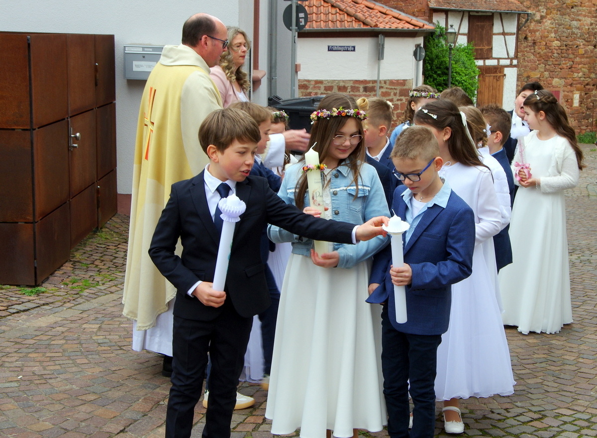 Vor den von Kommunionkindern verlesenen Fürbitten entzündete der Küster Günter Rosenberger die Kommunionkerzen und die Kinder stellten sich damit um den Altar, um ihre Taufgelübde zu erneuern. Die gemeinde bestätigte dies mit dem Lied "Fest soll mein Taufbund immer stehen".