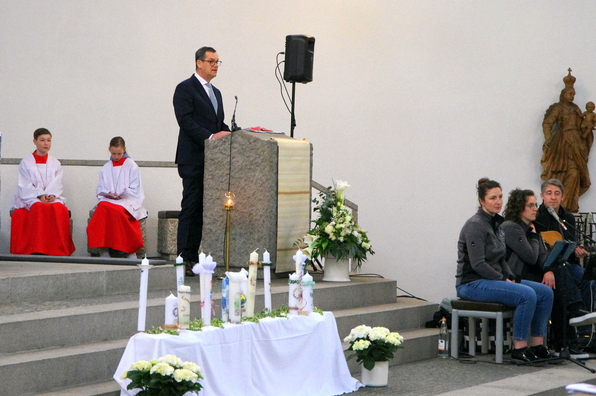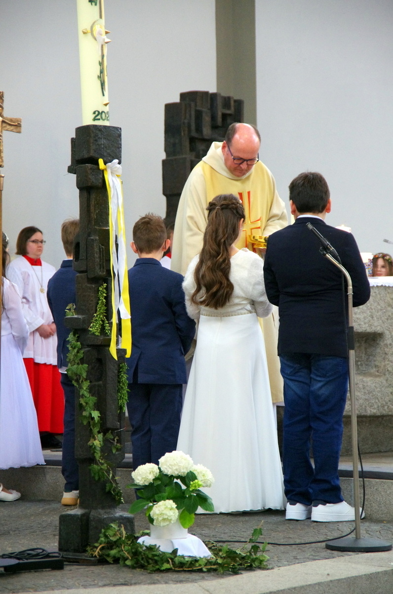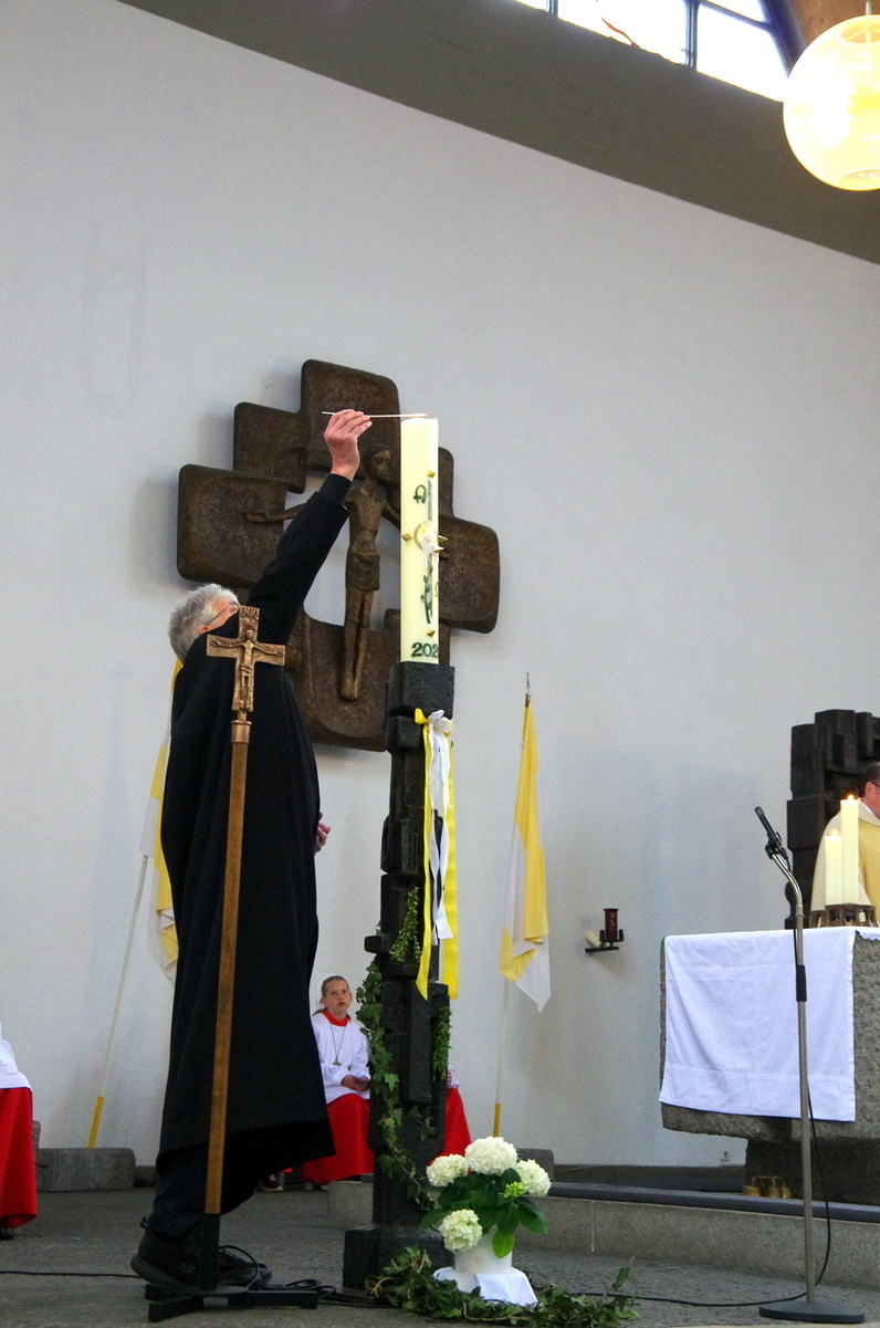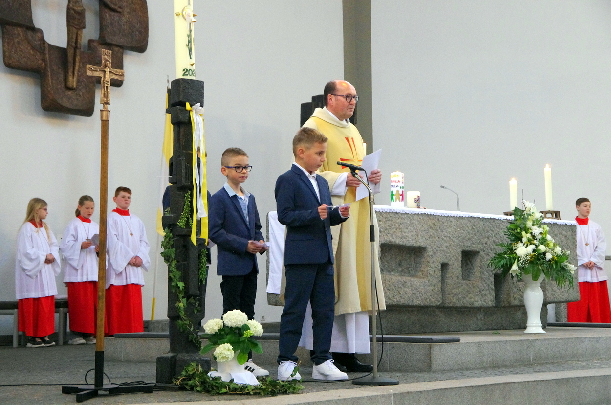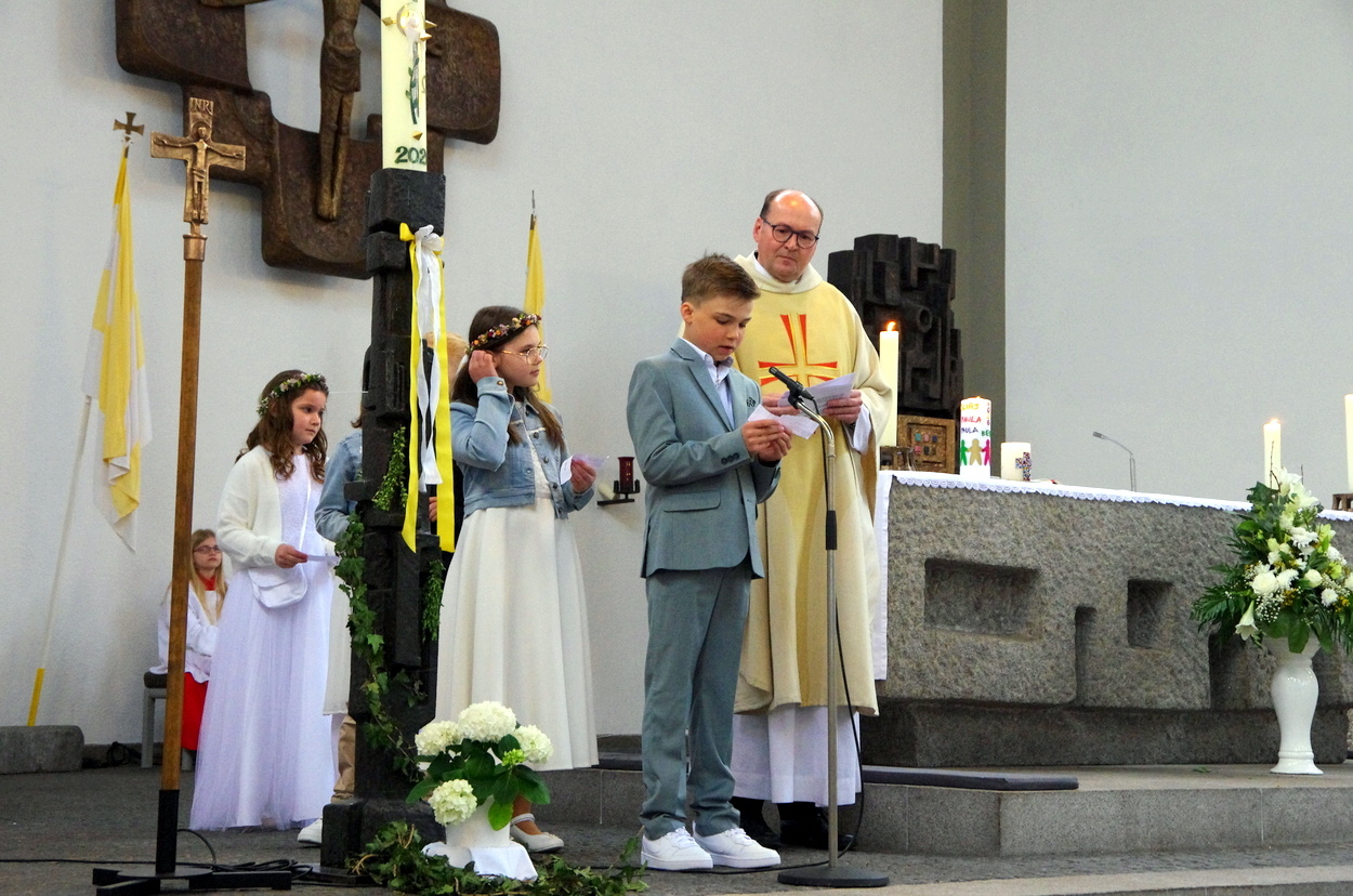 Vor den von Kommunionkindern verlesenen Fürbitten entzündete der Küster Günter Rosenberger die Kommunionkerzen und die Kinder stellten sich damit um den Altar, um ihre Taufgelübde zu erneuern. Die gemeinde bestätigte dies mit dem Lied "Fest soll mein Taufbund immer stehen".