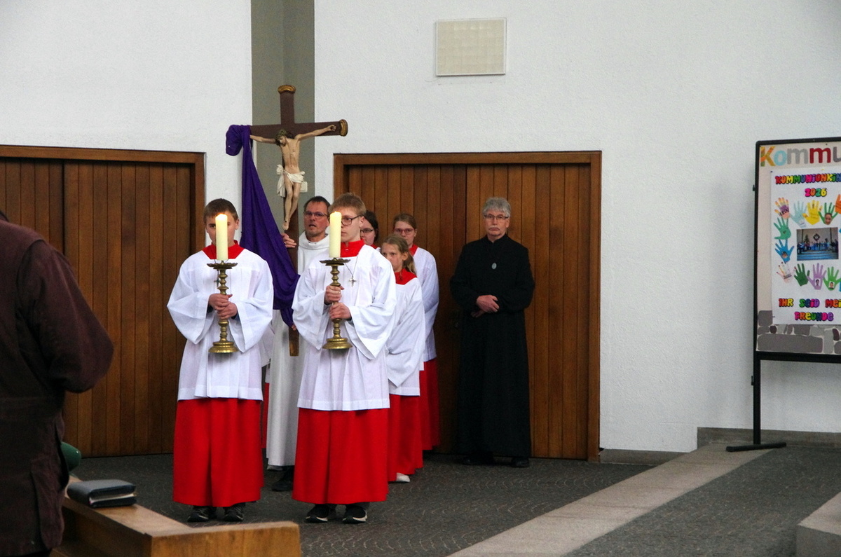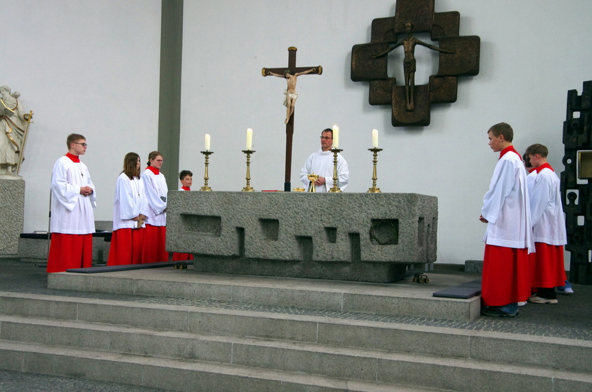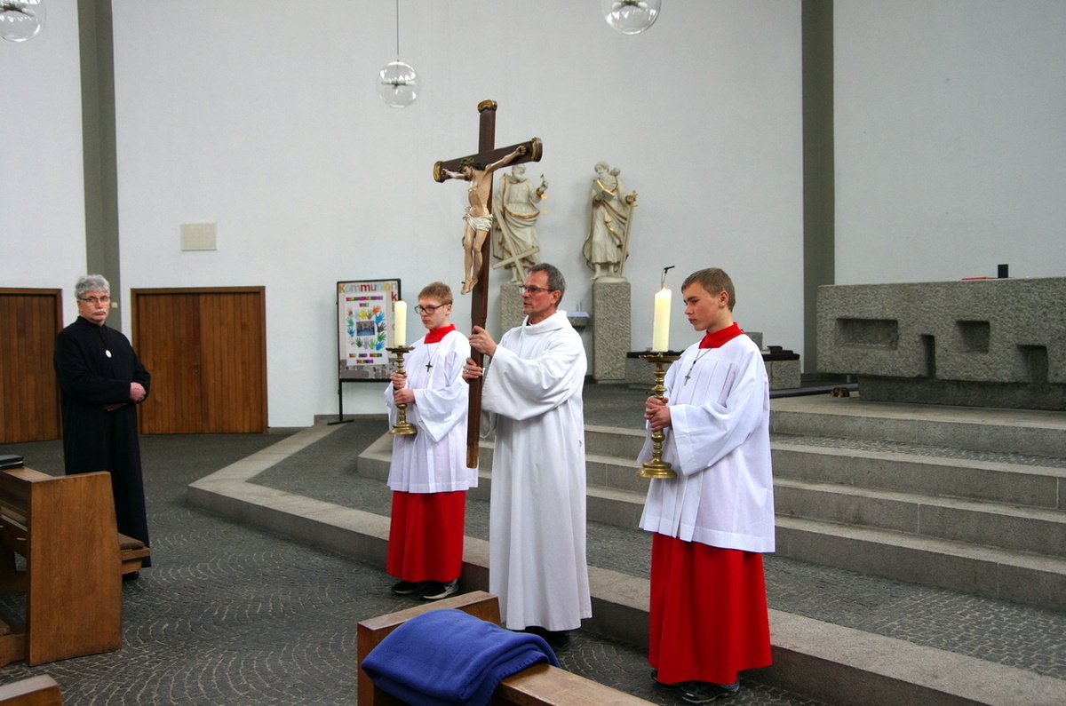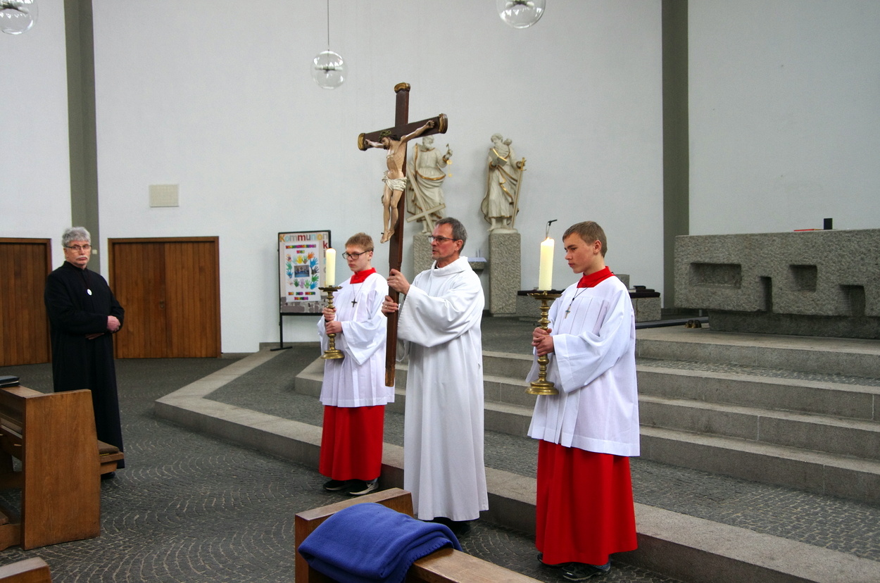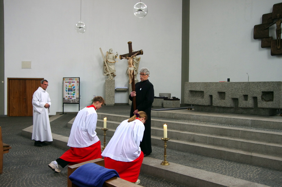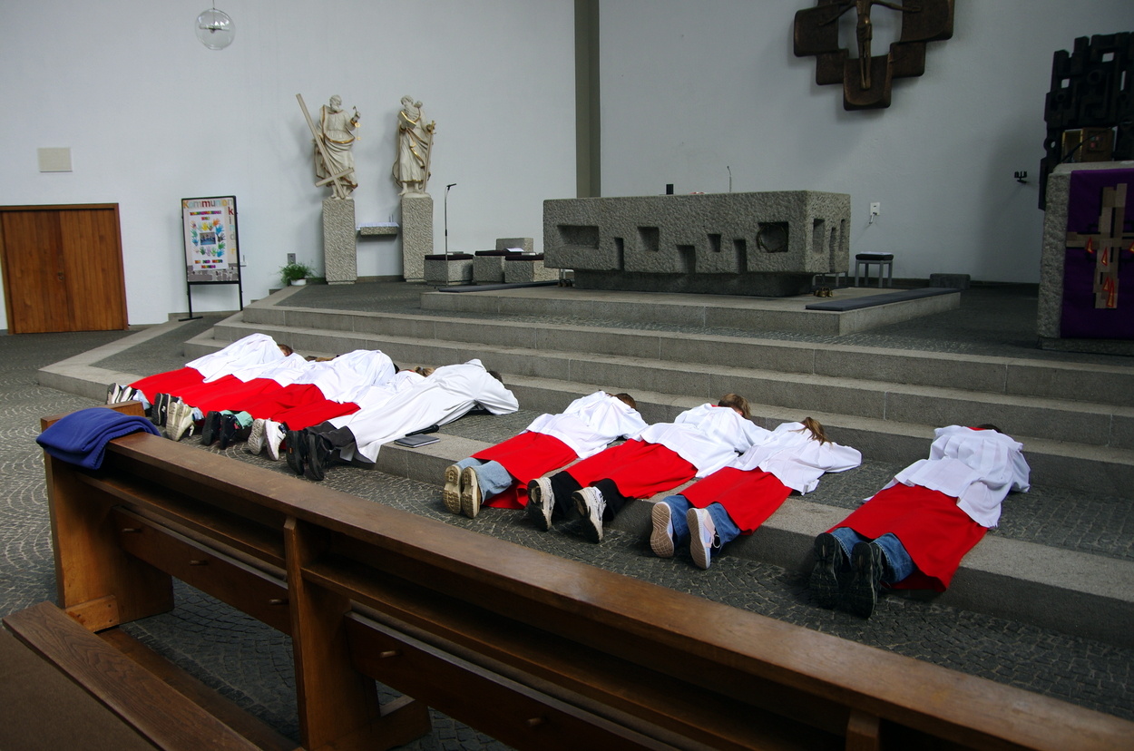 Aus - nichts mehr. Jesus ist gestorben. Die Verzweifelung durchzieht die Karfreitagsliturgie. Die 12 Messdiener ziehen mit PR Benjamin Riebel in den leeren Kircheraum ein und werfen sich zu Boden. Aus ist's.