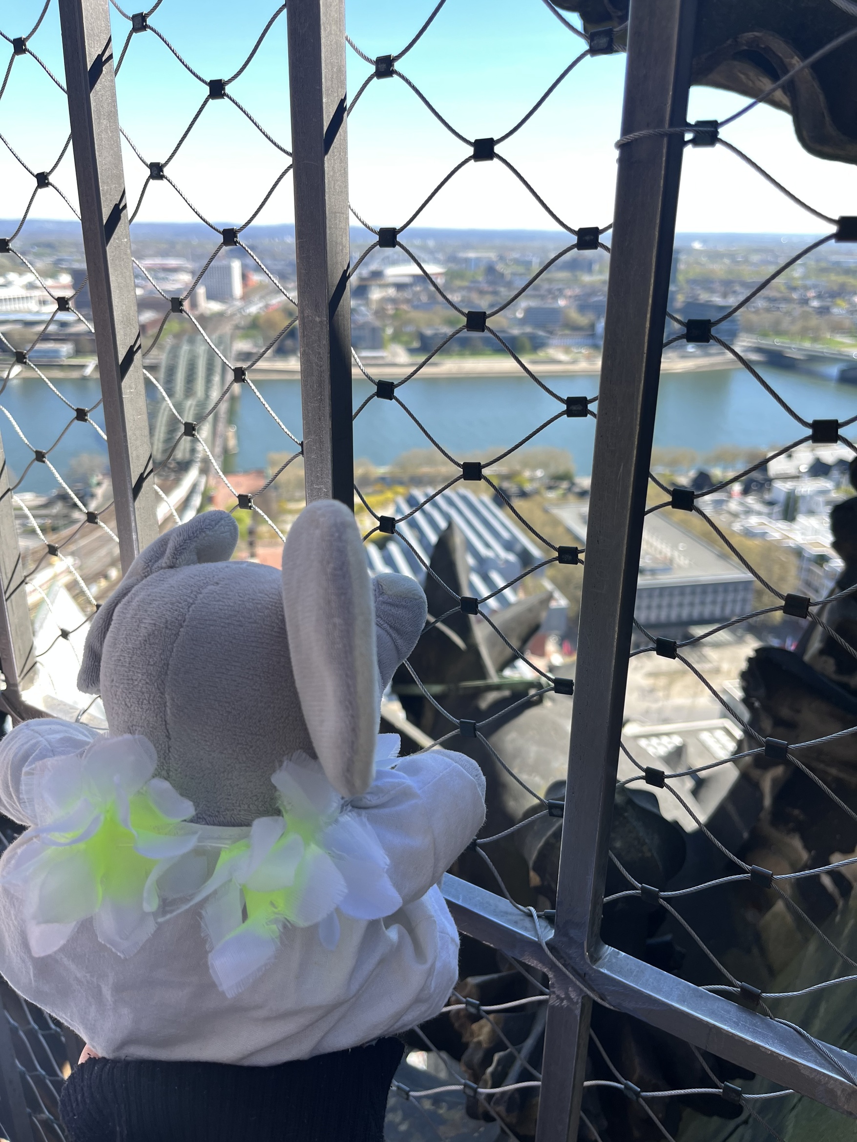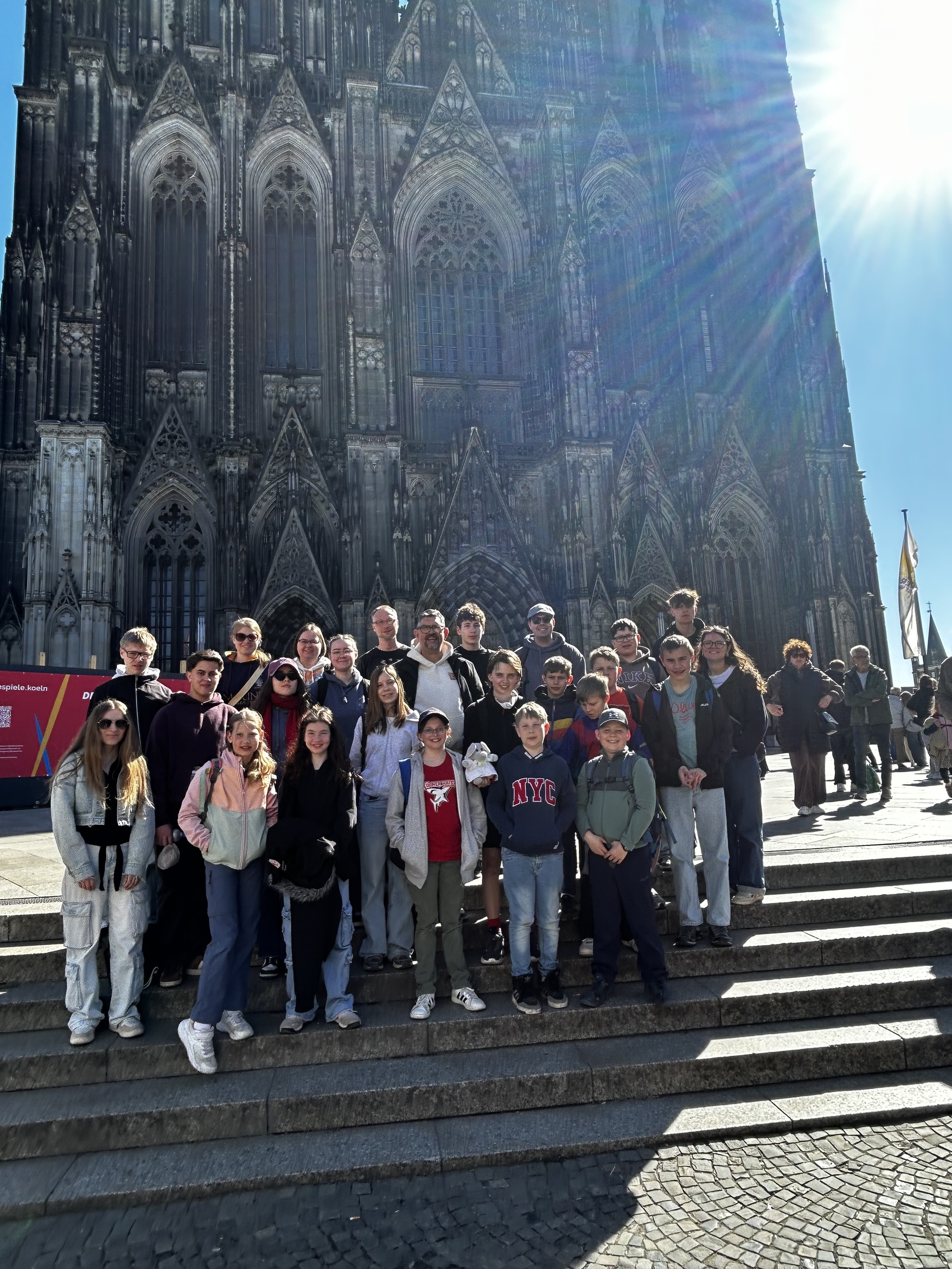 Die Rheinländer kamen dafür am Mittwoch voll auf ihre Kosten, als wir gemeinsam nach Köln fuhren. In der dortigen „Bahnhofskapelle“ (so nannte sie ein Einheimischer) beteiligten wir uns am mittäglichen Friedensgebet, bevor alle, die im Kletterwald noch nicht genügend Höhenmeter gesammelt hatten, den Turm des Doms erklommen. Bei bestem Wetter konnten wir den Blick über das Rheinland bis zum Siebengebirge genießen. Während die Betreuer danach erst einmal eine Pause brauchten, machten sich die Kinder mit großem Eifer an die Stadtrallye, bei der sie auch weniger bekannte Ecken Kölns erkundeten. Mit nur einem halben Punkt Vorsprung gewann das Siegerteam Kugelschreiber von der Maus und dem Elefanten, während die übrigen Teilnehmer als Souvenir Köln-Bleistifte mit nach Hause nehmen konnten. Ebenso ehrgeizig ging es beim bunten Abend zu, bei dem vier Teams in verschiedenen Spielen (z. B. „Wer baut den schönsten Osterhasen aus seinem Reisegepäck?“ oder „Wer kennt die meisten kölschen und fränkischen Begriffe?“) um den Sieg konkurrierten. Dabei gab es – dem Unterbringungsort entsprechend – Haribo zu gewinnen.