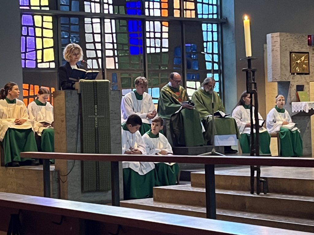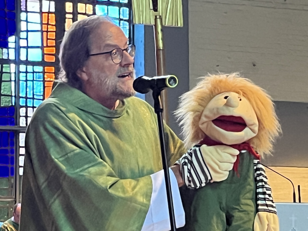 Die Pfarrei Corpus Domini feierte am Sonntag, dem 28.09.2025 ihr Pfarrfest. Wie es sich gehört, wurde mit einem Familiengottesdienst in der Corpus-Domini-Kirche begonnen. Diakon Höfer hatte seine Handpuppe „Pelle“ mitgebracht. Beide tauschten sich über das Evangelium vom „Reichen Prasser und dem armen Lazarus“ aus, so, damit es auch die Kinder verstehen konnten.