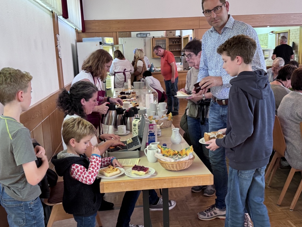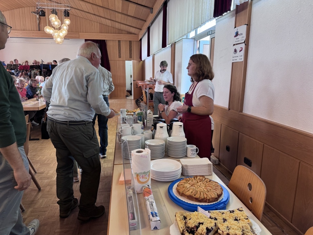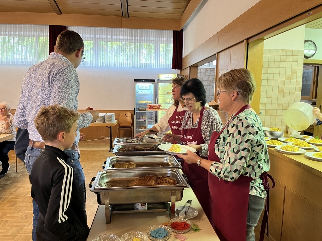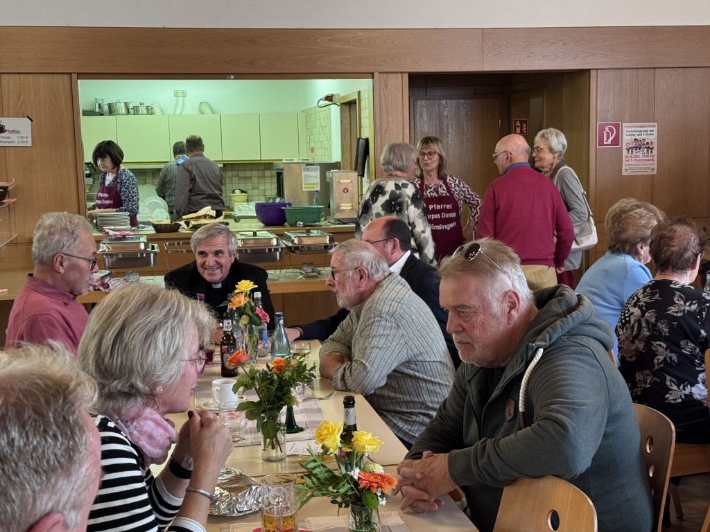 Nach dem Gottesdienst traf man sich zum gemeinsamen Mittagessen im gut besetzten Pfarrsaal bei Schnitzeln und vegetarischen Bratlingen mit Kartoffelsalat und anschließend bei Kaffee und Kuchen. Auch hier zeigte sich schon im Vorfeld der gute Zusammenhalt durch die vielen Helfern im Organisationsteam, beim Tische stellen und dekorieren, in der Küche und an den Ausgabestellen. Besonderen Dank auch den Spender/innen von Kuchen – und Kartoffelsalat.