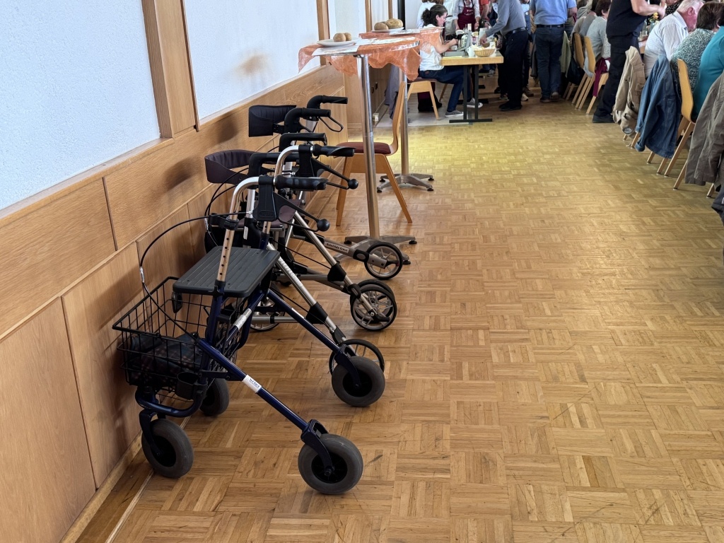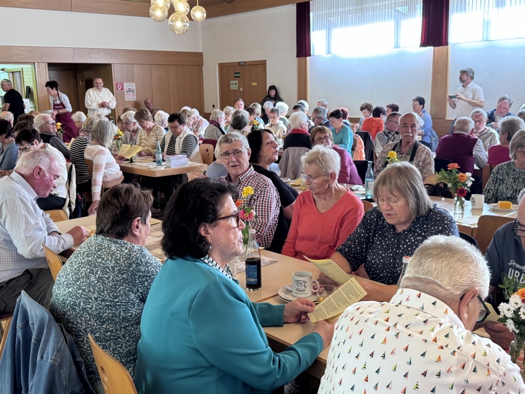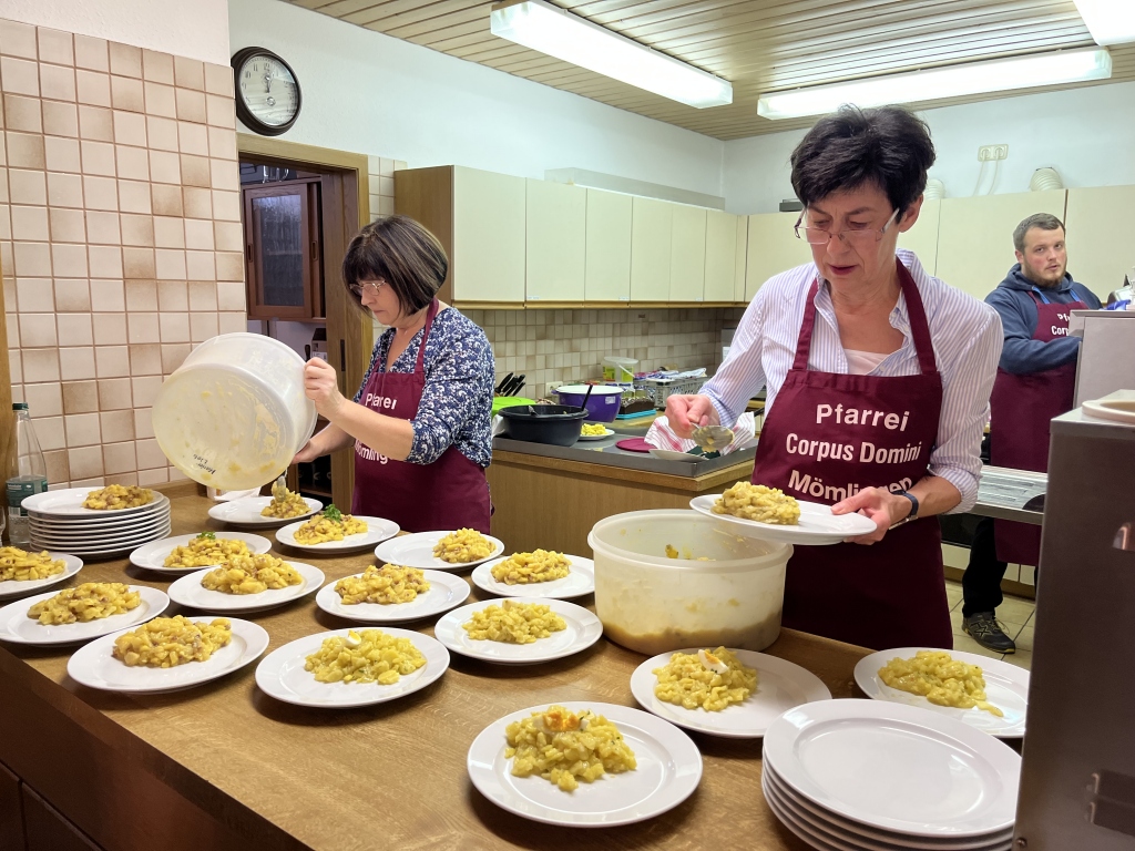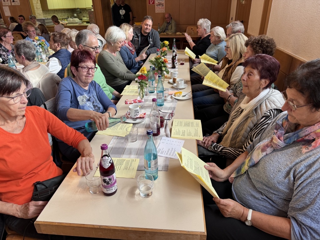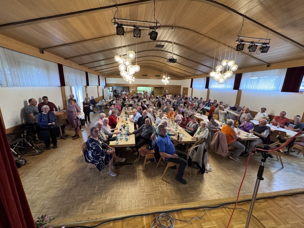Nach dem Gottesdienst traf man sich zum gemeinsamen Mittagessen im gut besetzten Pfarrsaal bei Schnitzeln und vegetarischen Bratlingen mit Kartoffelsalat und anschließend bei Kaffee und Kuchen. Auch hier zeigte sich schon im Vorfeld der gute Zusammenhalt durch die vielen Helfern im Organisationsteam, beim Tische stellen und dekorieren, in der Küche und an den Ausgabestellen. Besonderen Dank auch den Spender/innen von Kuchen – und Kartoffelsalat.