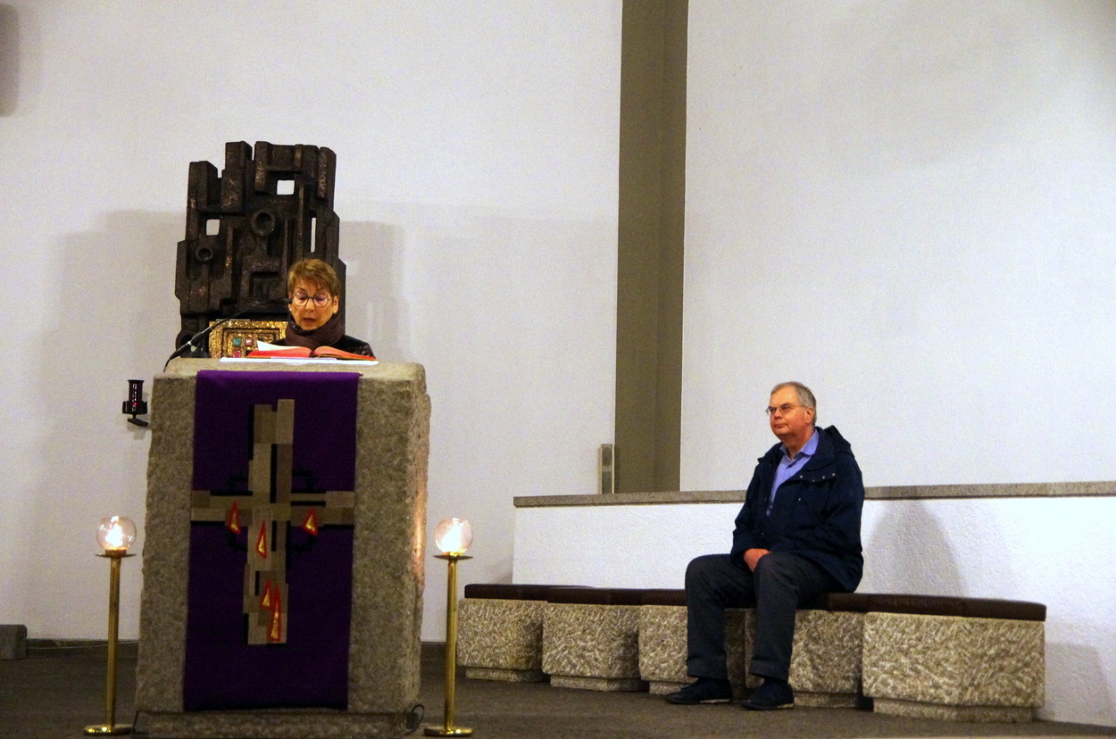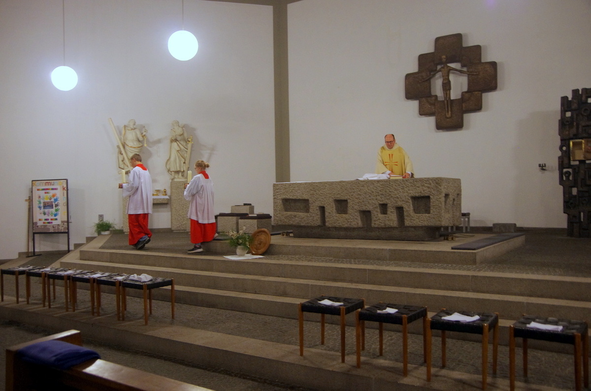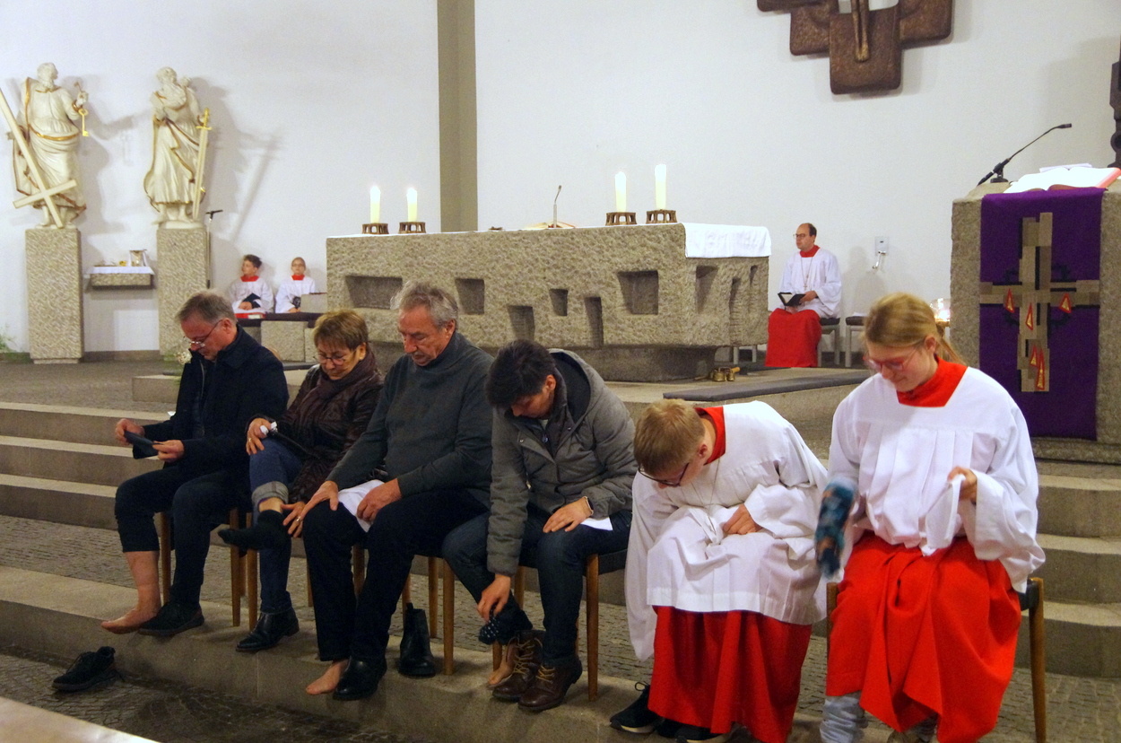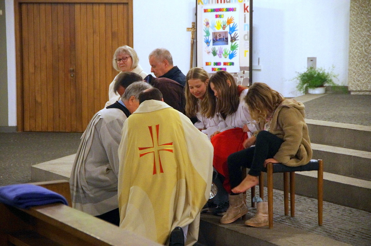 Dazu gehört nicht nur das Abendmahl, sondern auch die Fußwaschung - wie Jesus zu Petrus sagte: "Wenn ich Dich nicht wasche, hast Du keine Gemeinschaft mit mir". Zugegebenermaßen gab es ein Missverständnis über die Frage, werd das heuer organisiert und so tat es keiner - aber Pfr Rettinger fragte vor der Messe die Besucher und so fanden sich 12 Gemeindemitglieder, denen stellvertretend die Füße gewaschen wurden. Zuvor hatte Pfr Rettinger gepredigt und war dabei auf die Kommunion eingegangen: Wenn man so nach vorne gehe, lasse man die Gedanken los. Vorne werde die Hostie gezeigt und dazu gesagt "das ist der Leib Christi". Dies bestätige man mit "Amen". Damit bringe man seinen Glauben zum Ausdruck, in der Hostie Jesus selber zu begegnen, Jesus, der der Sohn Gottes, mein Freund sei. Die Kommunion heiße, Jesus als Geschenk zu empfangen und in sein Herz aufzunehmen.