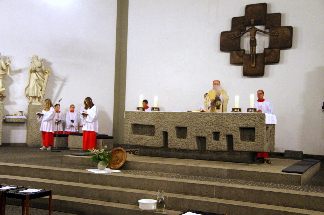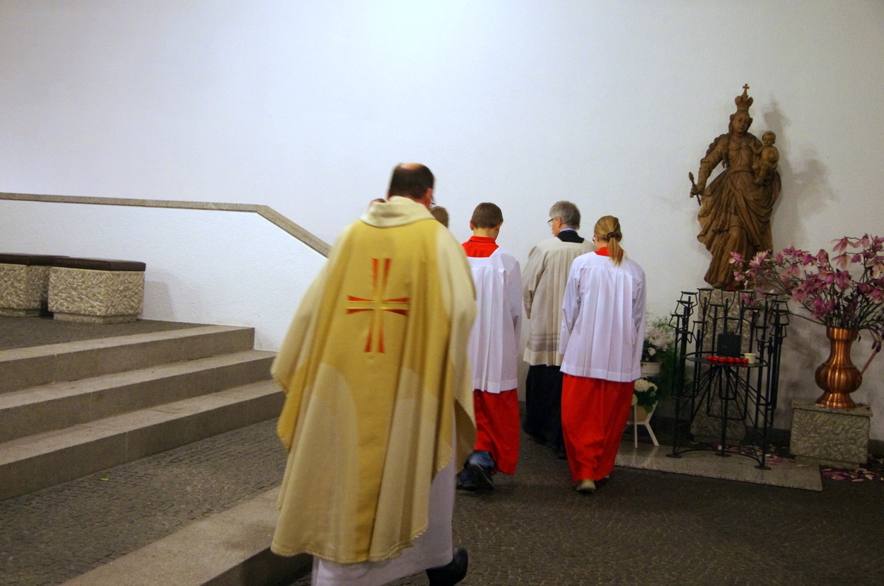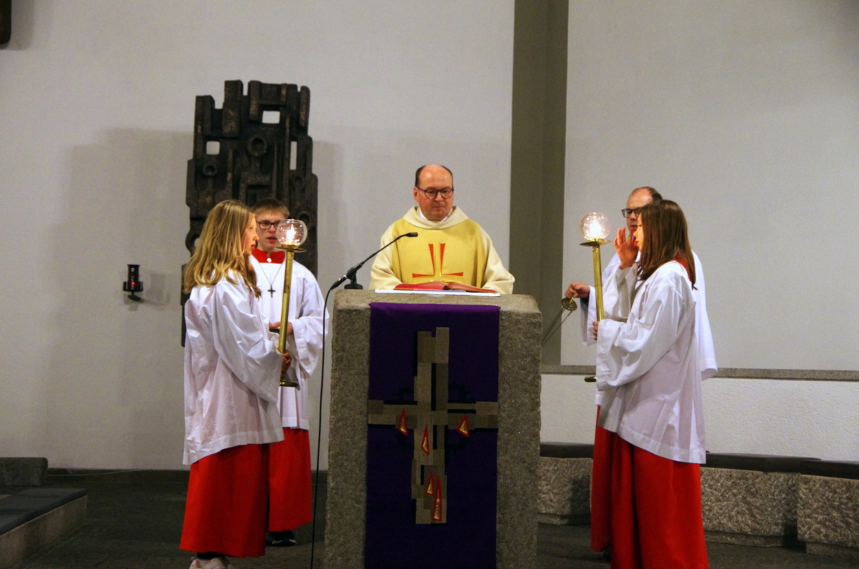 Dazu gehört nicht nur das Abendmahl, sondern auch die Fußwaschung - wie Jesus zu Petrus sagte: "Wenn ich Dich nicht wasche, hast Du keine Gemeinschaft mit mir". Zugegebenermaßen gab es ein Missverständnis über die Frage, werd das heuer organisiert und so tat es keiner - aber Pfr Rettinger fragte vor der Messe die Besucher und so fanden sich 12 Gemeindemitglieder, denen stellvertretend die Füße gewaschen wurden. Zuvor hatte Pfr Rettinger gepredigt und war dabei auf die Kommunion eingegangen: Wenn man so nach vorne gehe, lasse man die Gedanken los. Vorne werde die Hostie gezeigt und dazu gesagt "das ist der Leib Christi". Dies bestätige man mit "Amen". Damit bringe man seinen Glauben zum Ausdruck, in der Hostie Jesus selber zu begegnen, Jesus, der der Sohn Gottes, mein Freund sei. Die Kommunion heiße, Jesus als Geschenk zu empfangen und in sein Herz aufzunehmen.